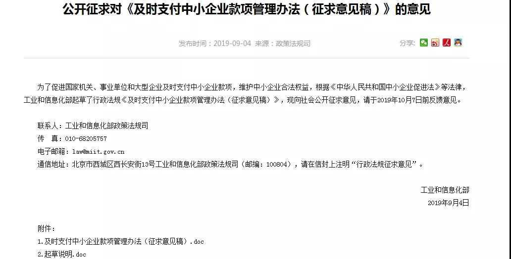 2019年9月,工信部發布《及時支付中小企業款項管理辦法(征求意見稿)》,提出: