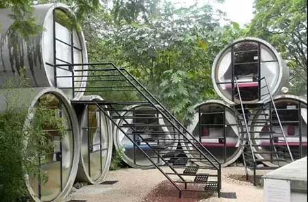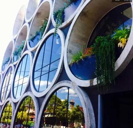 水泥管層疊起來(lái)加上玻璃和綠植